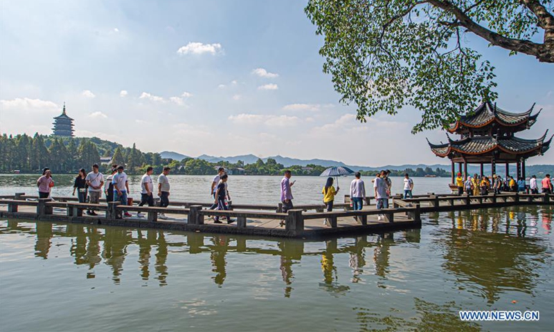 People visit the West Lake in Hangzhou, capital of east China's Zhejiang Province, Oct. 1, 2020. People celebrate the National Day holiday in various ways. (Photo by Jiang Han/Xinhua)