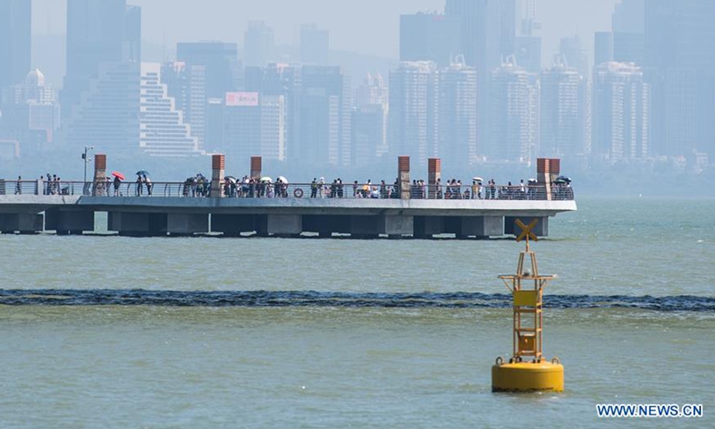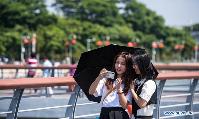 Tourists take photos at a park in Shenzhen, south China's Guangdong Province, Oct. 2, 2020. (Xinhua/Mao Siqian)