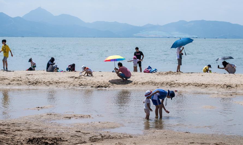 People have fun on a beach at a park in Shenzhen, south China's Guangdong Province, Oct. 2, 2020. (Xinhua/Mao Siqian)