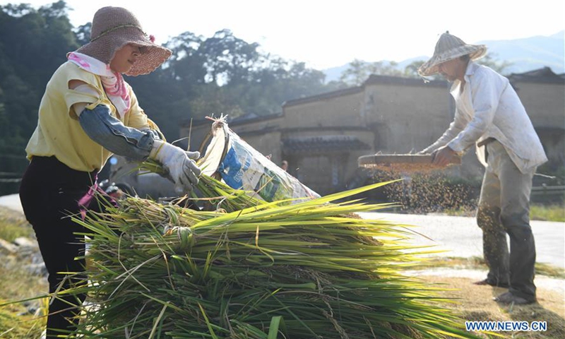 Farmers thresh rice stalks in Shangde Village of Minqing County, southeast China's Fujian Province, Oct. 2, 2020. Recently, rice in Minqing County ushered in harvest season. Many migrant workers returned to their hometown during the National Day Holiday to harvest crops. (Xinhua/Song Weiwei)