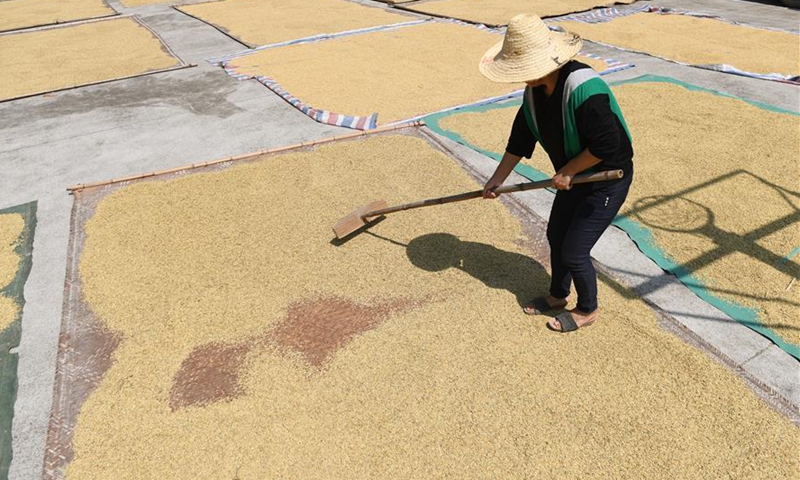 A farmer dries harvested rice outdoors in Julin Village of Minqing County, southeast China's Fujian Province, Oct. 2, 2020. Recently, rice in Minqing County ushered in harvest season. Many migrant workers returned to their hometown during the National Day Holiday to harvest crops. (Xinhua/Song Weiwei)
