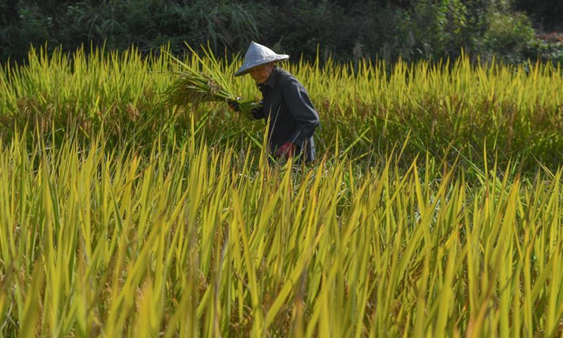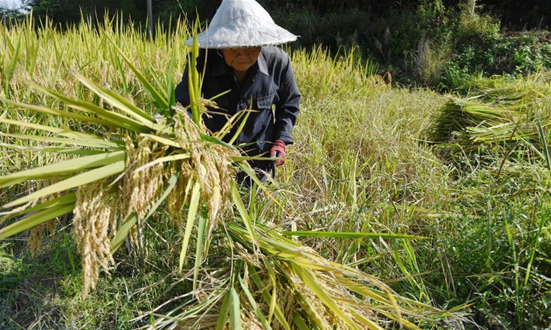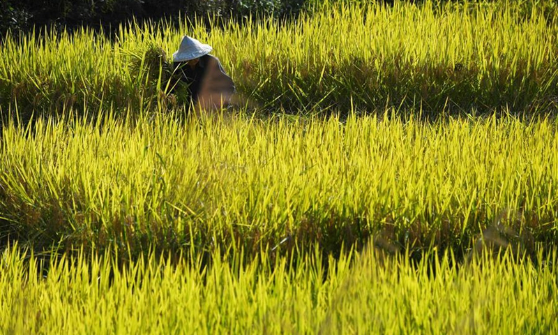 A farmer harvests rice in a paddy field in Shangde Village of Minqing County, southeast China's Fujian Province, Oct. 2, 2020. Recently, rice in Minqing County ushered in harvest season. Many migrant workers returned to their hometown during the National Day Holiday to harvest crops. (Xinhua/Song Weiwei)