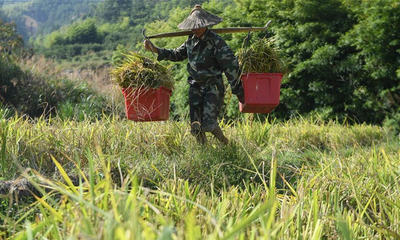 A villager delivers baskets full of rice stalks in Shangde Village of Minqing County, southeast China's Fujian Province, Oct. 2, 2020. Recently, rice in Minqing County ushered in harvest season. Many migrant workers returned to their hometown during the National Day Holiday to harvest crops. (Xinhua/Song Weiwei)