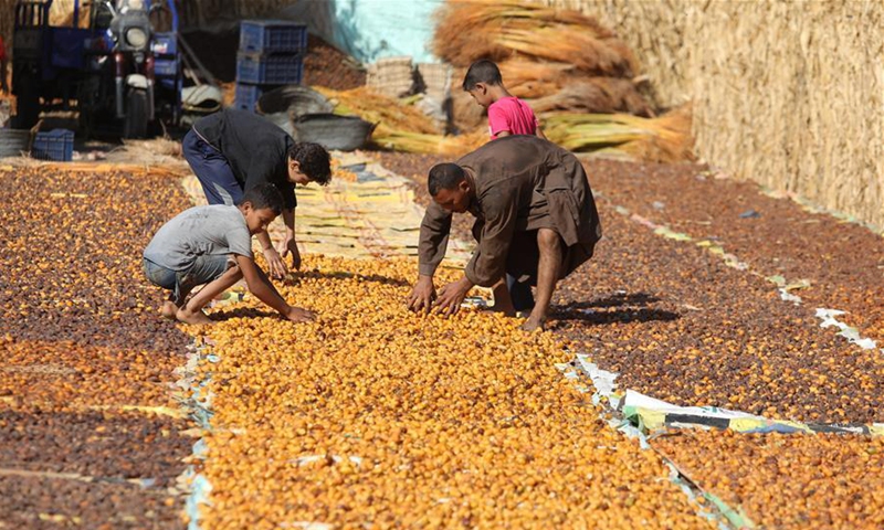 Farmers sort freshly picked dates during the annual harvest season in Dahshour village in Giza, Egypt, Oct. 2, 2020. (Xinhua/Ahmed Gomaa)