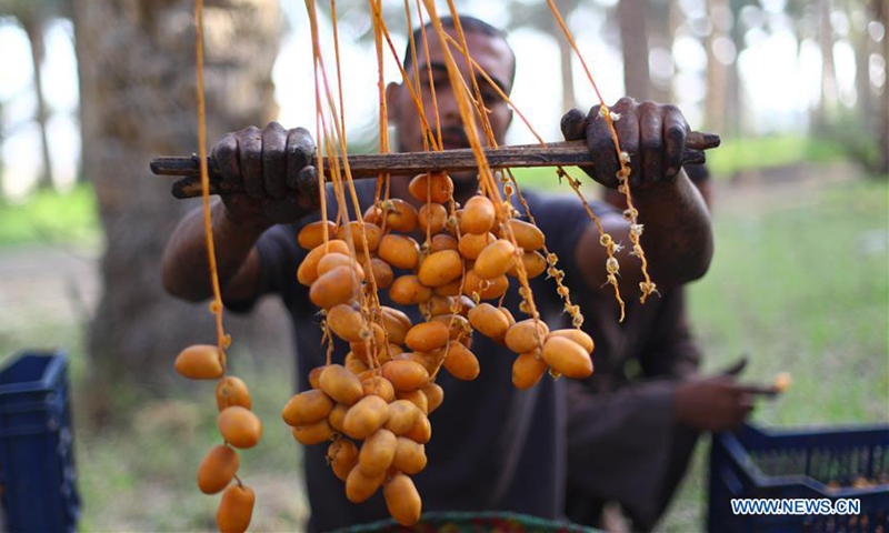 A man harvests dates from a date palm during the annual harvest season in Dahshour village in Giza, Egypt, Oct. 2, 2020. (Xinhua/Ahmed Gomaa)