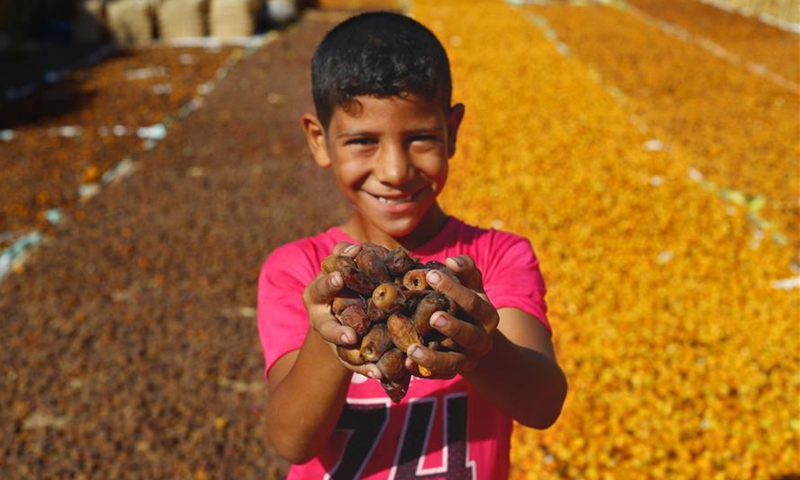 A boy displays freshly picked dates during the annual harvest season in Dahshour village in Giza, Egypt, Oct. 2, 2020. (Xinhua/Ahmed Gomaa)