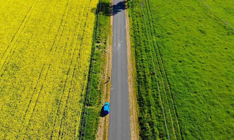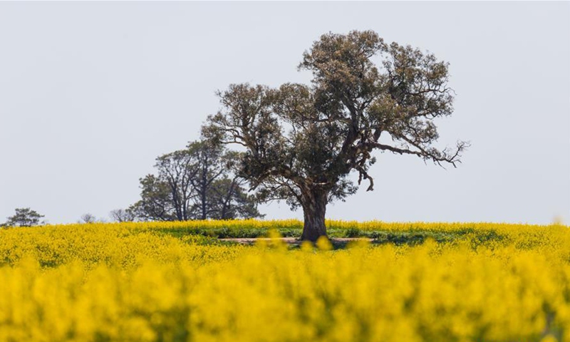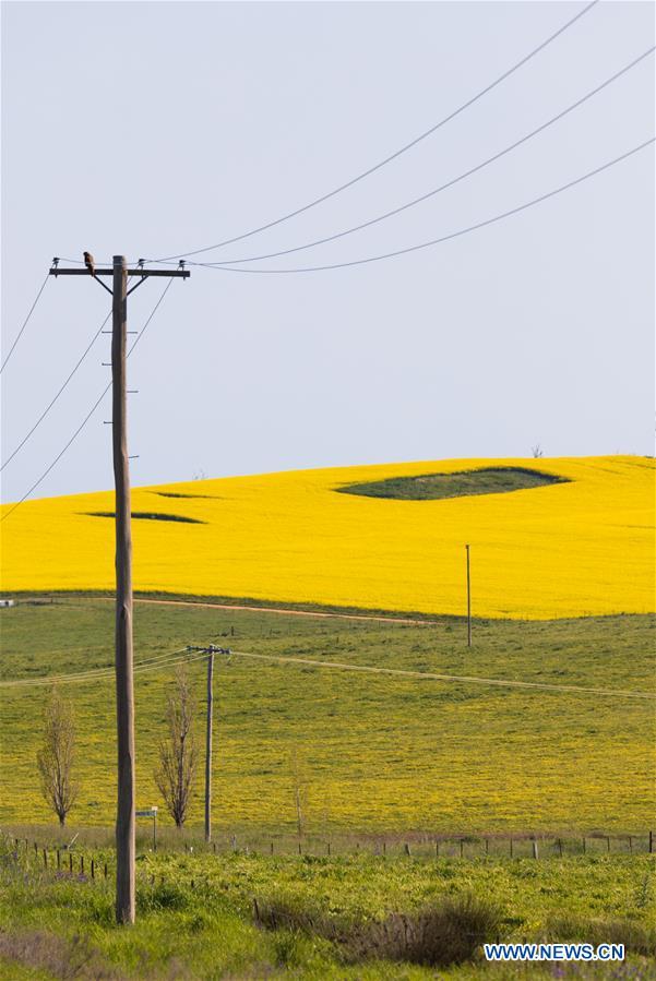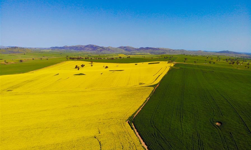 Aerial photo taken on Oct. 2, 2020 shows the view of a canola field outside Canberra, capital of Australia. (Photo by Liu Changchang/Xinhua)