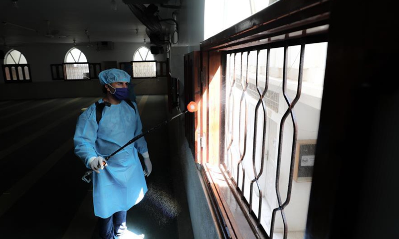 A Palestinian employee sterilizes a mosque as a preventive measure amid the COVID-19 pandemic in the southern Gaza Strip city of Khan Younis, Oct. 2, 2020. (Photo by Yasser Qudih/Xinhua)