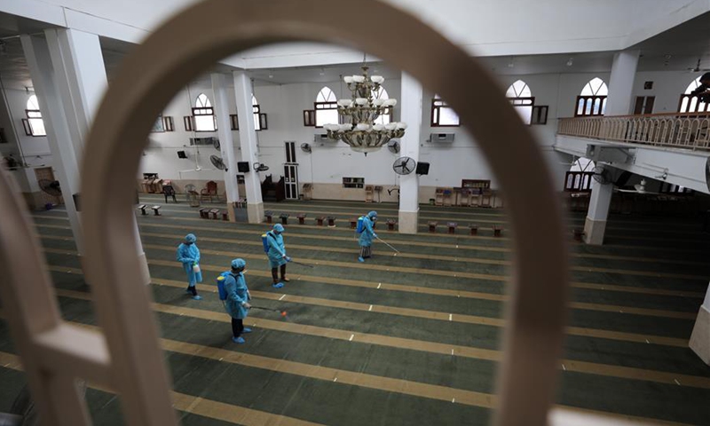 Palestinian employees sterilize a mosque as a preventive measure amid the COVID-19 pandemic in the southern Gaza Strip city of Khan Younis, Oct. 2, 2020. (Photo by Yasser Qudih/Xinhua)