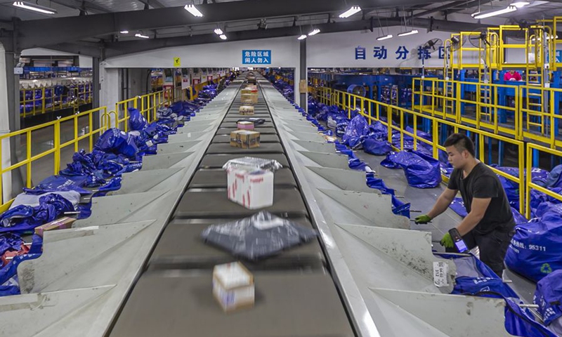 An employee works at the transit center of Zhongtong Express in Shanghai, east China, Nov. 12, 2019. (Photo: Xinhua)