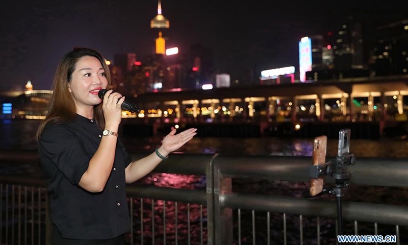 A music enthusiast livestreams singing during the National Day and Mid-Autumn Festival holiday at Victoria Harbour in south China's Hong Kong, Oct. 3, 2020.(Photo: Xinhua)
