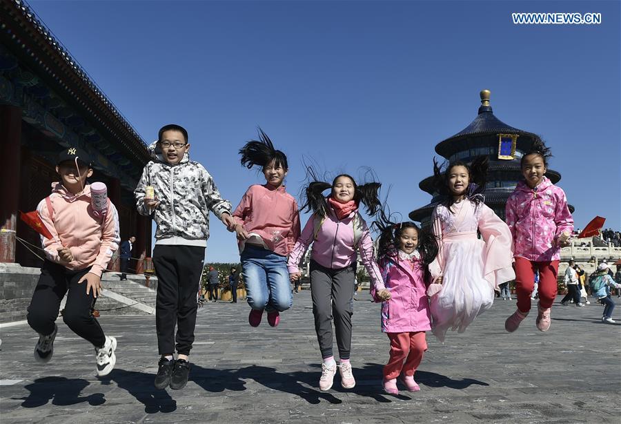 Children jump for a group photo in front of the Temple of Heaven during the National Day and Mid-Autumn Festival holiday in Beijing, capital of China, Oct. 4, 2020. (Xinhua/Lu Peng)