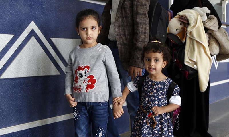 Two girls returning from Jordan by a UN plane are seen at the Sanaa International Airport in Sanaa, Yemen, on Oct. 4, 2020. A UN plane brought Yemeni civilian patients to the Houthi militia-held capital Sanaa in Yemen on Sunday after they were airlifted earlier this year to Jordan to undergo treatment for critical illness. (Photo by Mohammed Mohammed/Xinhua)