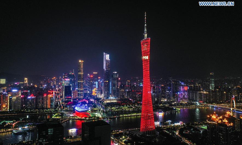 Photo taken on Oct. 3, 2020 shows the night view of Canton Tower in Guangzhou, capital of south China's Guangdong Province. Until 15:00 p.m. of Oct. 4, 150 registered scenery spots in Guangdong Province had received about 7.8 million visitors in total in the National Day and Mid-Autumn Festival holiday. Rural trips, history and cultural trips and night trips have become popular choices for tourists. (Xinhua/Liu Dawei)