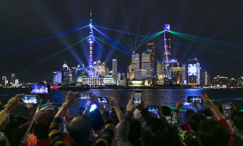 People enjoy a light show at the Bund in east China's Shanghai, on Oct. 5, 2020, the fifth day of National Day and Mid-Autumn Festival holiday. (Xinhua/Wang Xiang)