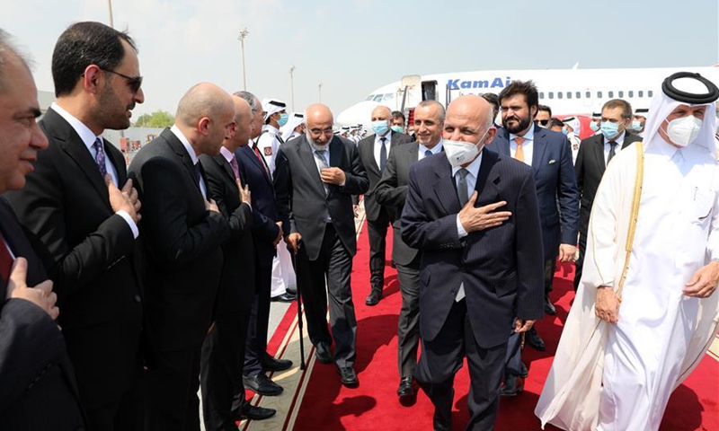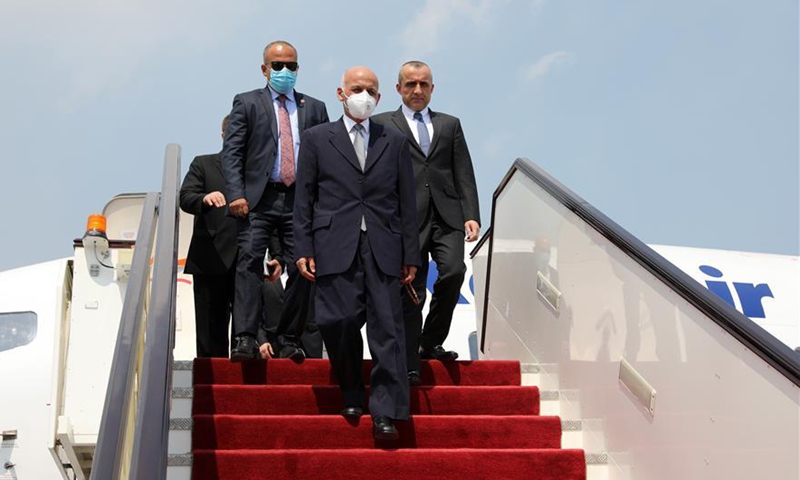 Afghan President Mohammad Ashraf Ghani arrives at Doha International Airport in Doha, Qatar on Oct. 5, 2020. Afghan President Mohammad Ashraf Ghani on Monday left Kabul for Kuwait and Qatar for an official visit, the Presidential Palace said. (Afghan Presidential Palace/Handout via Xinhua)
