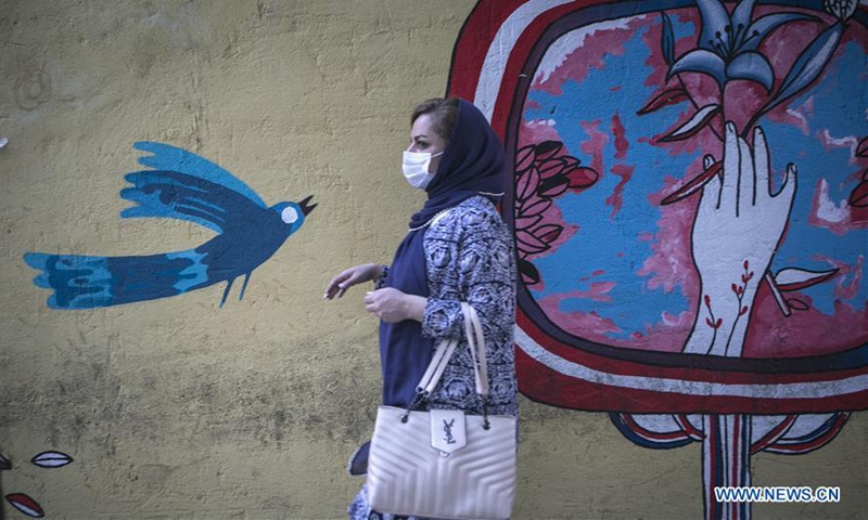 A woman wearing a face mask walks on a street in Tehran, Iran, on Sept. 26, 2020. The total number of COVID-19 infections confirmed in Iran reached 443,086 on Saturday, after an overnight registration of 3,204 cases, Iran's Ministry of Health and Medical Education announced. (Photo by Ahmad Halabisaz/Xinhua)
