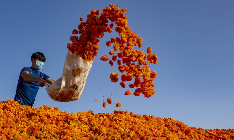 A villager pours marigolds into a fermenting tank at an agricultural industrial park in Yutian County, northwest China's Xinjiang Uygur Autonomous Region, Sept. 20, 2020. As one of the five counties in Hotan Prefecture that have not been lifted out of poverty, Yutian County is accelerating its steps to shake off poverty by planting marigold. (Xinhua/Hu Huhu)