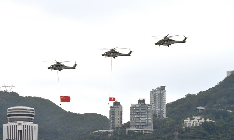 Helicopters with Chinese national flag and the flag of the Hong Kong Special Administrative Region fly over the Victoria Harbour in a procession to celebrate the 71st anniversary of the founding of the People's Republic of China and the Mid-Autumn Festival in Hong Kong, south China, Oct. 1, 2020. (Xinhua/Lo Ping Fai)
