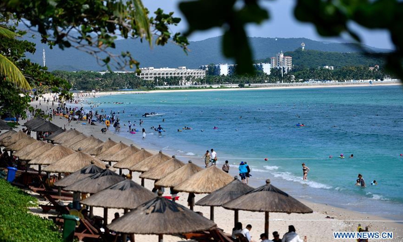 Tourists have fun at Dadonghai scenic area in Sanya City, south China's Hainan Province, Oct. 6, 2020. Tourist attractions in Sanya attracted tourists all over the country during the National Day and Mid-Autumn Festival holiday. (Xinhua/Guo Cheng)