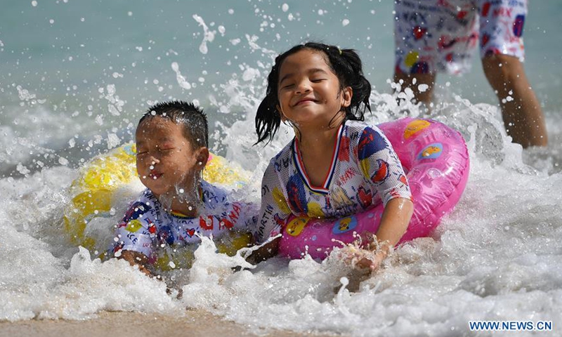Children have fun at Dadonghai scenic area in Sanya City, south China's Hainan Province, Oct. 6, 2020. Tourist attractions in Sanya attracted tourists all over the country during the National Day and Mid-Autumn Festival holiday. (Xinhua/Guo Cheng)