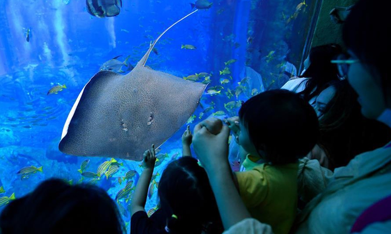 Tourists have fun at an aquarium in Sanya City, south China's Hainan Province, Oct. 5, 2020. Tourist attractions in Sanya attracted tourists all over the country during the National Day and Mid-Autumn Festival holiday. (Xinhua/Guo Cheng)