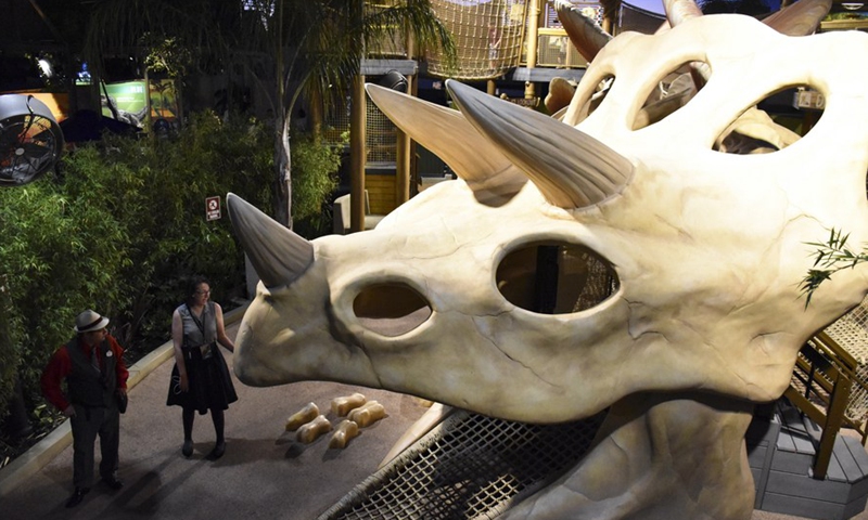 People visit "Jurassic World," a theme park which combines a new thrilling ride with attractions from the film "Jurassic World," in Universal Studios Hollywood in Los Angeles, the United States, on July 22, 2019. (Xinhua/Li Ying)