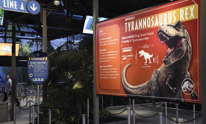 Photo taken on July 22, 2019 shows the entrance of "Jurassic World-The Ride" theme park in Universal Studios Hollywood in Los Angeles, the United States. (Xinhua/Li Ying)