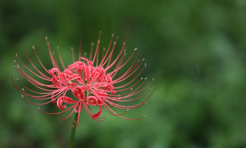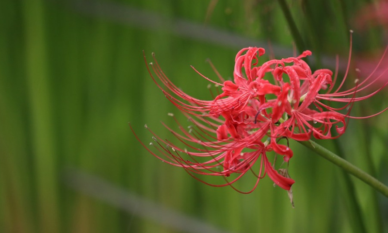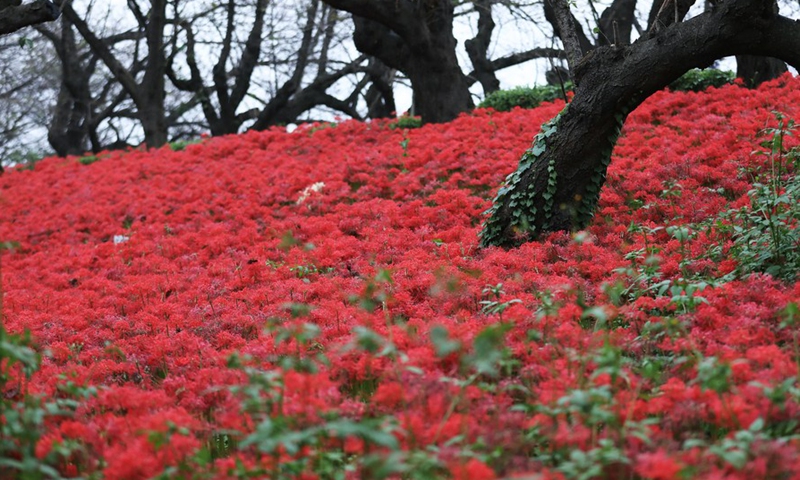 Photo taken on Oct. 7, 2020 shows Lycoris radiata, known as the red spider lily, at Gongendo Park in Satte, Saitama Prefecture of Japan. (Xinhua/Du Xiaoyi)