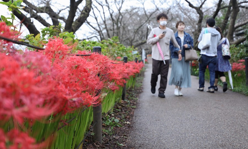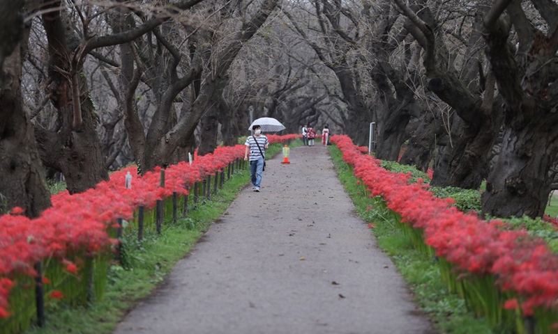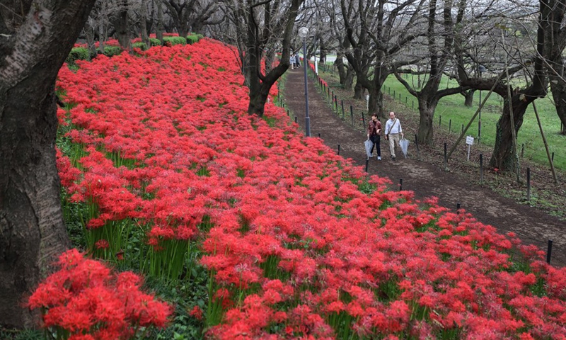 Visitors enjoy the Lycoris radiata, known as the red spider lilies, at Gongendo Park in Satte, Saitama Prefecture of Japan, on Oct. 7, 2020. (Xinhua/Du Xiaoyi)