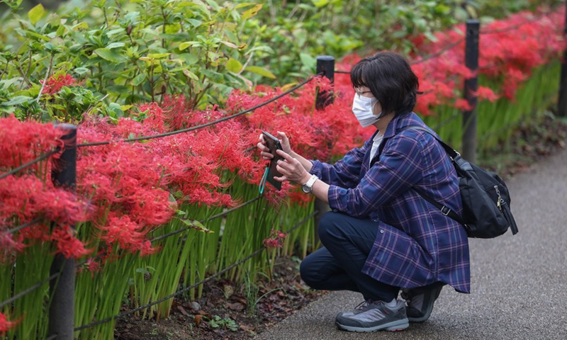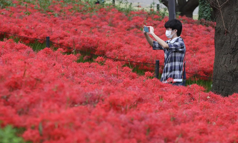 A visitor takes photos of Lycoris radiata, known as the red spider lilies, at Gongendo Park in Satte, Saitama Prefecture of Japan, on Oct. 7, 2020. (Xinhua/Du Xiaoyi)