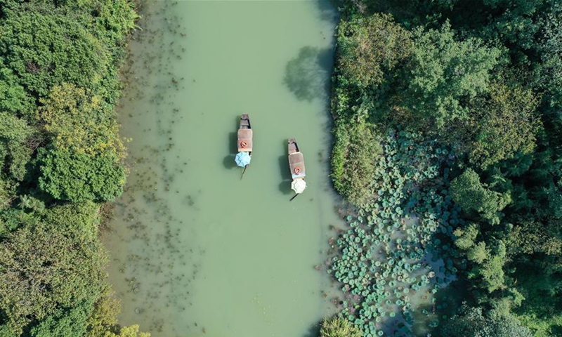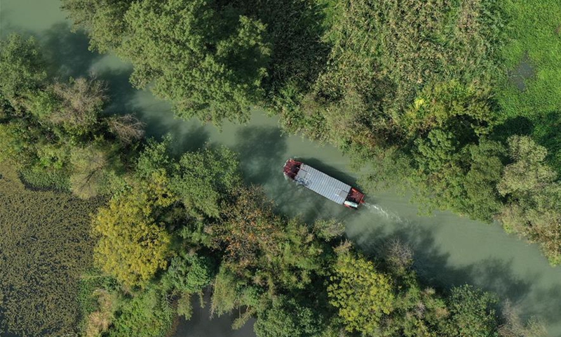 Aerial photo taken on Oct. 8, 2020 shows a sightseeing boat in Xixi National Wetland Park in Hangzhou, east China's Zhejiang Province. (Xinhua/Weng Xinyang)