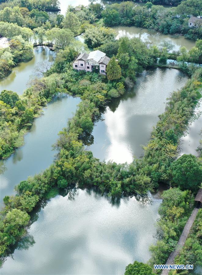 Aerial photo taken on Oct. 8, 2020 shows a view in Xixi National Wetland Park in Hangzhou, east China's Zhejiang Province. (Xinhua/Weng Xinyang)