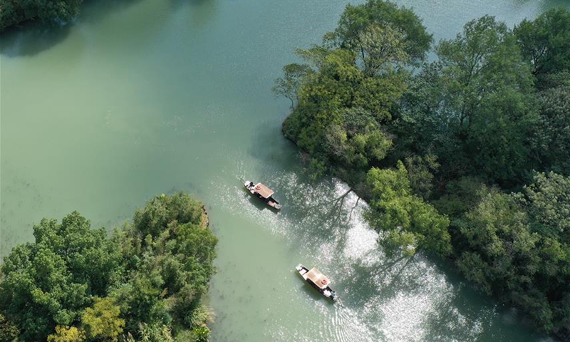 Aerial photo taken on Oct. 8, 2020 shows sightseeing boats in Xixi National Wetland Park in Hangzhou, east China's Zhejiang Province. (Xinhua/Weng Xinyang)