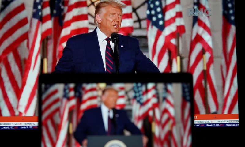 Photo taken in Arlington, Virginia, the United States, on Aug. 27, 2020 shows screens displaying U.S. President Donald Trump delivering his acceptance speech during the 2020 Republican National Convention.Photo:Xinhua