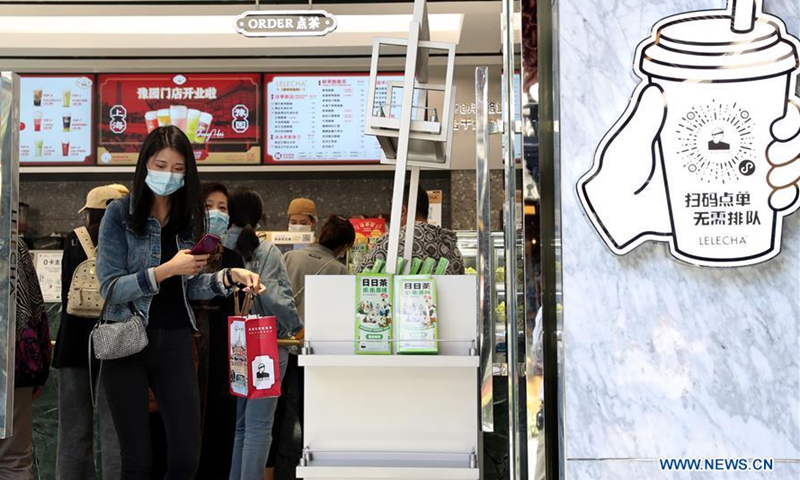 People walk out of a beverage shop at Yuyuan Garden in Shanghai, east China, Oct. 8, 2020. According to Shanghai Municipal Commission of Commerce, the sales volume of 437 large commercial enterprises in Shanghai have reached 12.38 billion yuan (about 1.82 billion U.S. dollars) during the eight-day National Day and Mid-Autumn Festival holiday, up 13.7 percent year on year.Photo:Xinhua