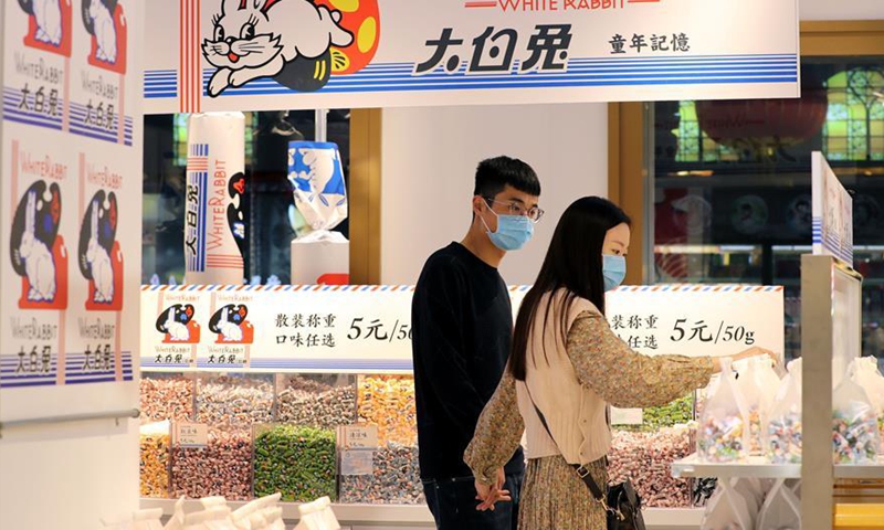 People shop at a White Rabbit candy franchise shop at Yuyuan Garden in Shanghai, east China, Oct. 8, 2020. According to Shanghai Municipal Commission of Commerce, the sales volume of 437 large commercial enterprises in Shanghai have reached 12.38 billion yuan (about 1.82 billion U.S. dollars) during the eight-day National Day and Mid-Autumn Festival holiday, up 13.7 percent year on year.Photo:Xinhua