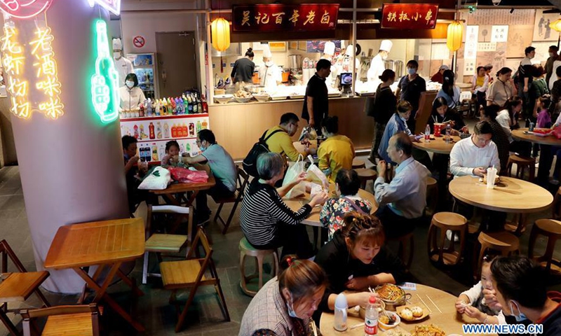 People taste snacks at Yuyuan Garden in Shanghai, east China, Oct. 8, 2020. According to Shanghai Municipal Commission of Commerce, the sales volume of 437 large commercial enterprises in Shanghai have reached 12.38 billion yuan (about 1.82 billion U.S. dollars) during the eight-day National Day and Mid-Autumn Festival holiday, up 13.7 percent year on year. Photo:Xinhua