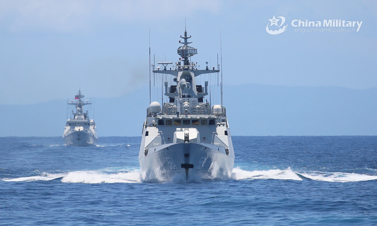 The guided-missile frigates Meizhou (Hull 584) and Liu Panshui (Hull 514) attached to a frigate flotilla with the navy under the PLA Southern Theater Command steam in line astern formation during a maritime realistic training exercise in waters of the South China Sea on July 13, 2020.Photo:China Military