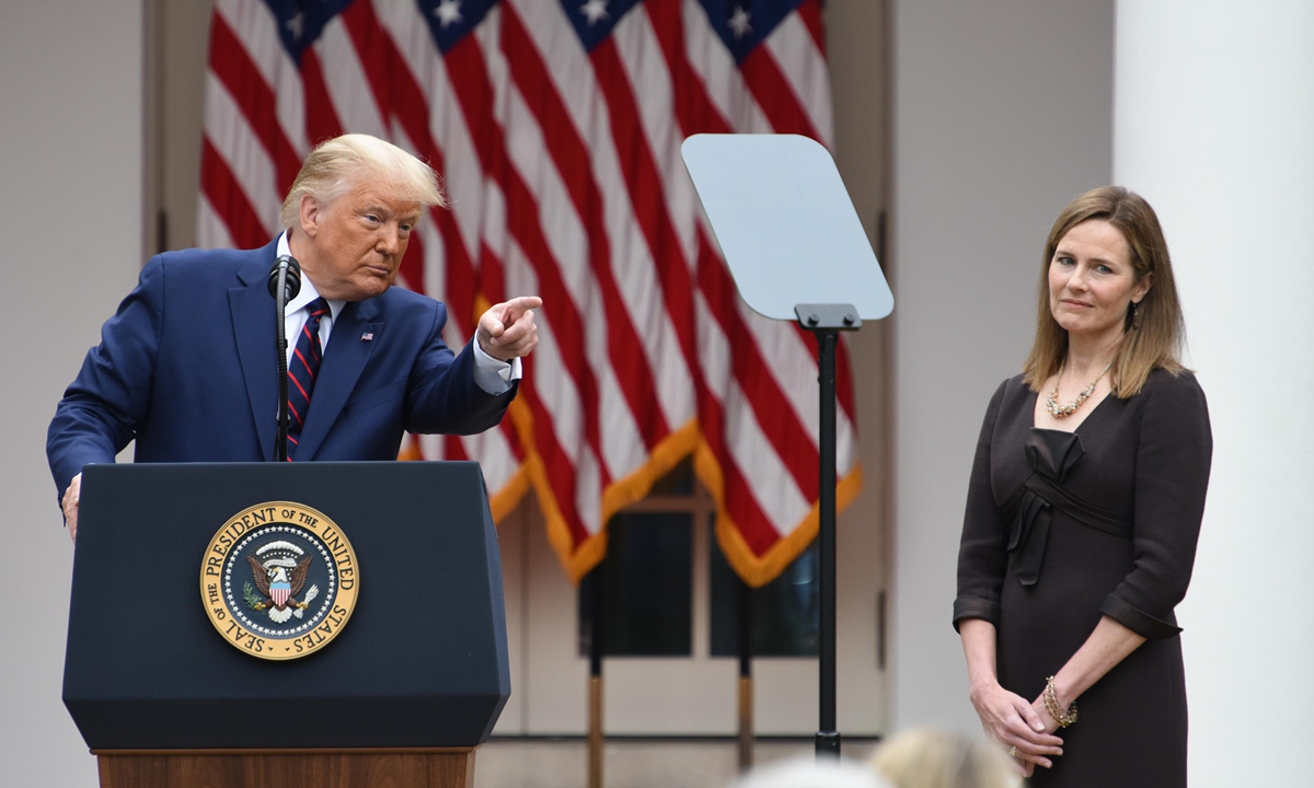 US President Donald Trump announces his US Supreme Court nominee, Judge Amy Coney Barrett (right), in the Rose Garden of the White House in Washington, DC, on Saturday US time. Barrett, if confirmed by the US Senate, will replace Justice Ruth Bader Ginsburg, who passed away on September 18. (See story on Page 7) Photo: VCG