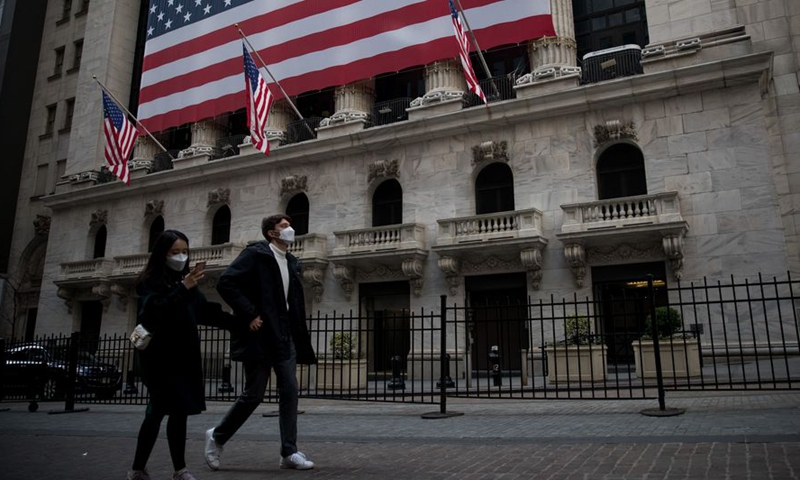 Pedestrians wearing face masks walk past the New York Stock Exchange (NYSE) in New York, the United States, on March 18, 2020.Photo:Xinhua