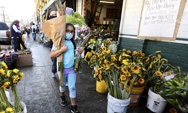 People shop at a flower market in downtown Los Angeles, the United States, May 8, 2020. (Xinhua)