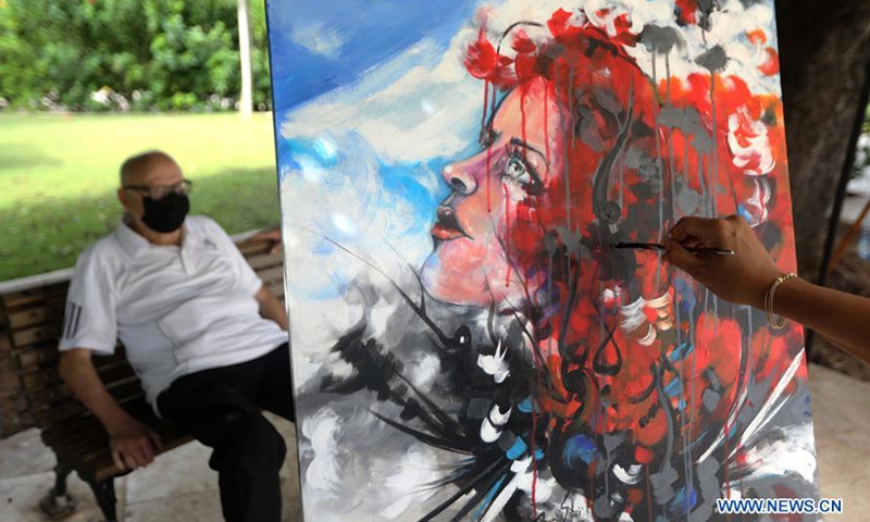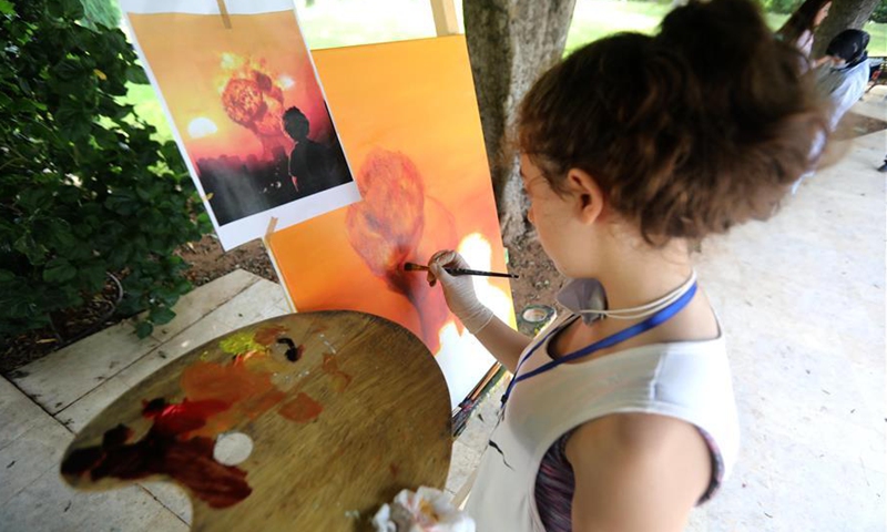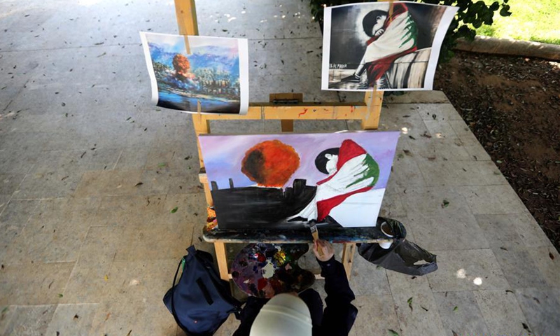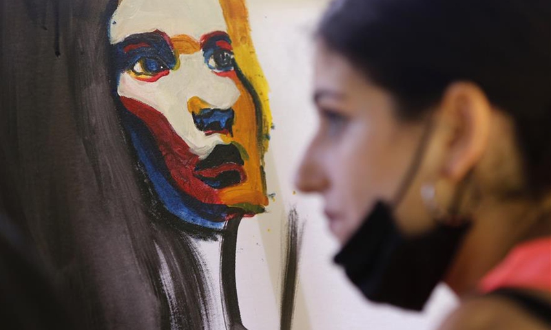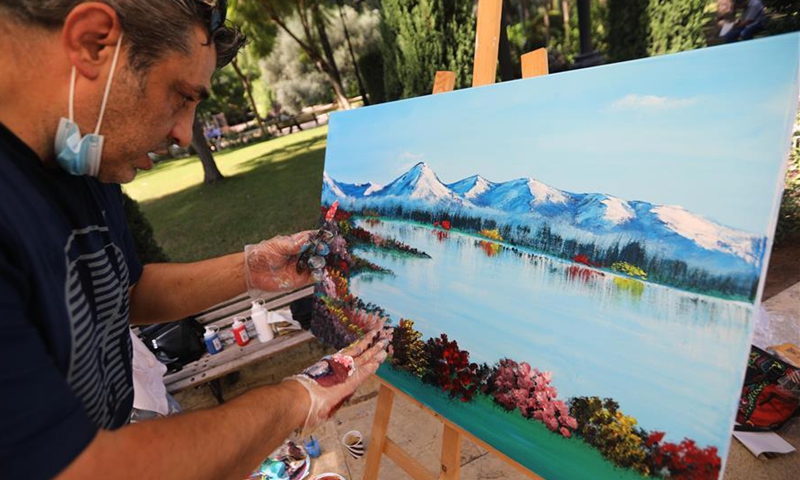 A painter works during an exhibition of paintings and sculptures at the Sanayeh Park in Beirut, Lebanon on Oct. 10, 2020. The proceeds of the exhibition will be used to help families affected by the Beirut port blasts. (Xinhua/Bilal Jawich)