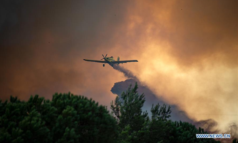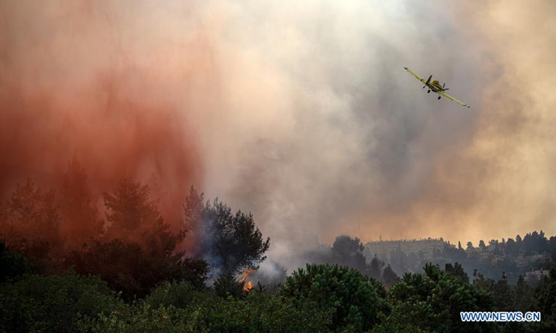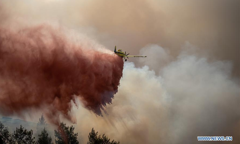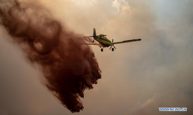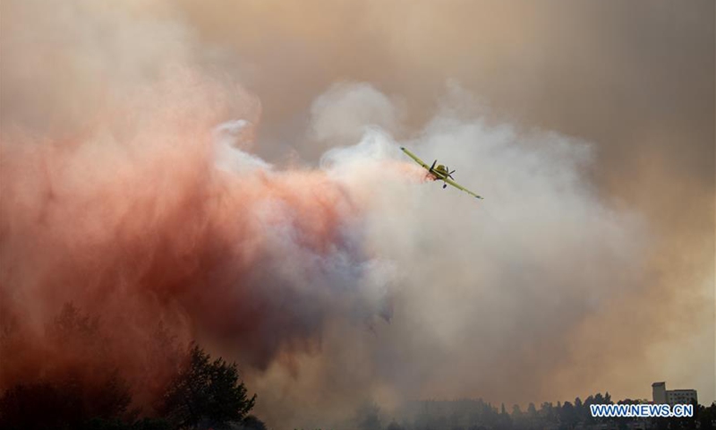 A firefighting plane tries to extinguish a forest fire near northern Israeli city of Nof HaGalil on Oct. 9, 2020. (Gil Eliyahu/JINI via Xinhua)