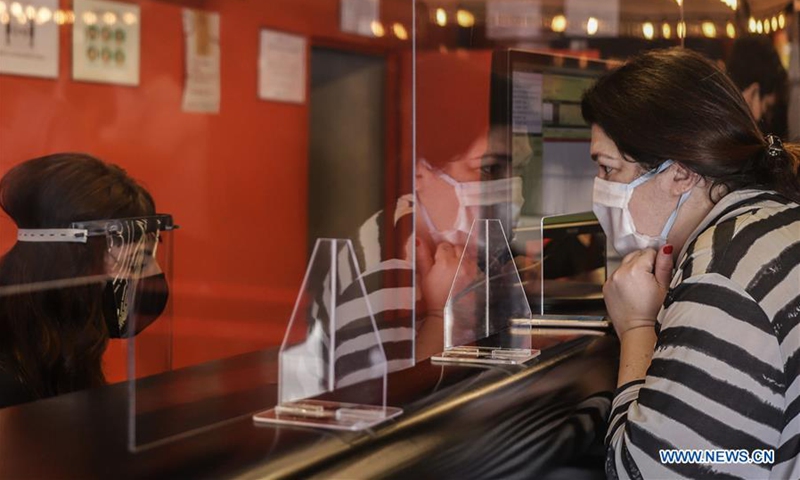 A woman buys movie tickets at the reopened "Belas Artes" cinema in Sao Paulo, Brazil on Oct. 10, 2020. The Brazilian city of Sao Paulo, the largest city in South America, has allowed cinemas, theaters, museums, and other cultural spaces to reopen starting on Saturday, as cases of the novel coronavirus (COVID-19) as well as hospital occupancy have declined, authorities announced on Friday. (Photo by Rahel Patrasso/Xinhua)