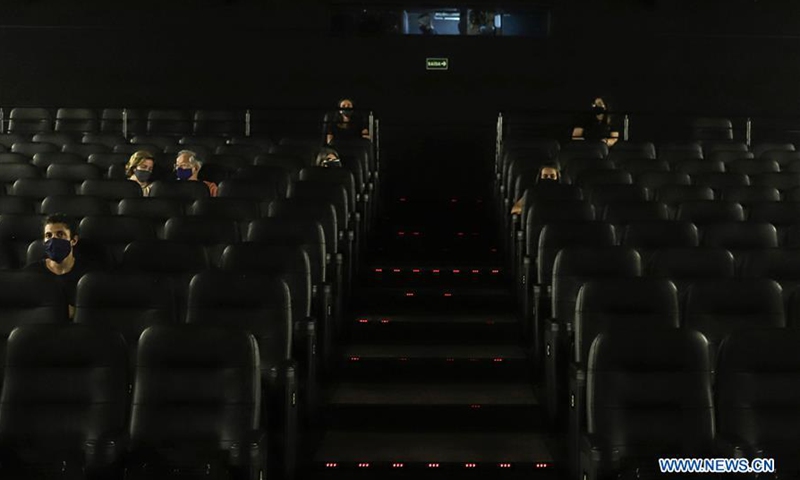 People sit at the reopened "Belas Artes" cinema in Sao Paulo, Brazil on Oct. 10, 2020. The Brazilian city of Sao Paulo, the largest city in South America, has allowed cinemas, theaters, museums, and other cultural spaces to reopen starting on Saturday, as cases of the novel coronavirus (COVID-19) as well as hospital occupancy have declined, authorities announced on Friday. (Photo by Rahel Patrasso/Xinhua)