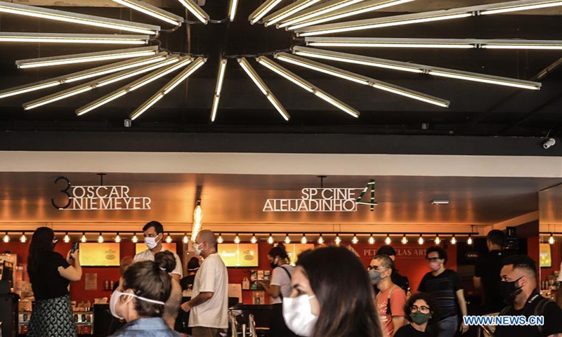People are seen at the reopened "Belas Artes" cinema in Sao Paulo, Brazil on Oct. 10, 2020. The Brazilian city of Sao Paulo, the largest city in South America, has allowed cinemas, theaters, museums, and other cultural spaces to reopen starting on Saturday, as cases of the novel coronavirus (COVID-19) as well as hospital occupancy have declined, authorities announced on Friday. (Photo by Rahel Patrasso/Xinhua)