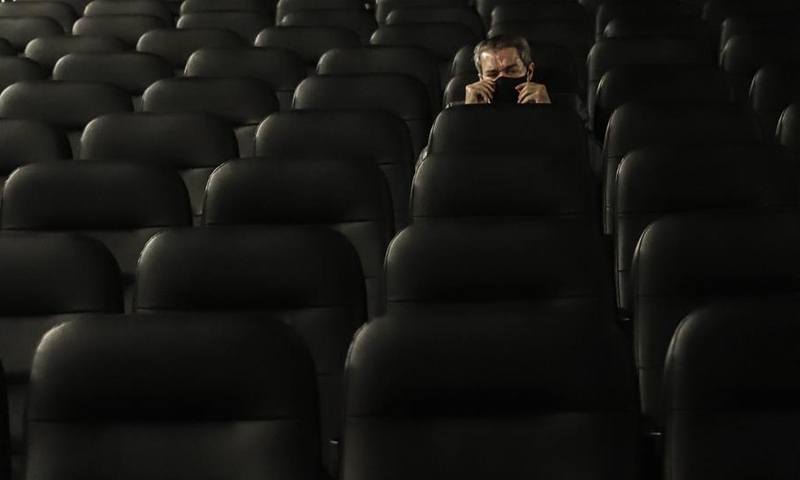 A man sits at the reopened "Belas Artes" cinema in Sao Paulo, Brazil on Oct. 10, 2020. The Brazilian city of Sao Paulo, the largest city in South America, has allowed cinemas, theaters, museums, and other cultural spaces to reopen starting on Saturday, as cases of the novel coronavirus (COVID-19) as well as hospital occupancy have declined, authorities announced on Friday. (Photo by Rahel Patrasso/Xinhua)
