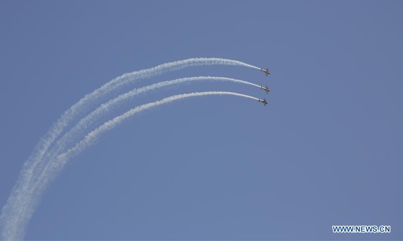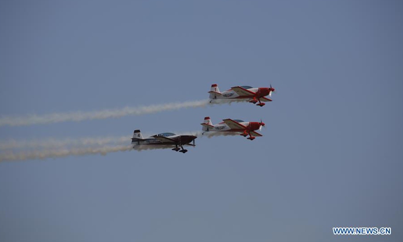 Aircrafts perform aerobatic maneuvres at the air show in Houston, the United States, on Oct. 10, 2020. The annual Wings Over Houston Airshow kicked off at the Ellington Airport on Saturday with thrilling aerial performances and displays. Visitors were asked to drive their cars to the show field and stay close to the cars during the show amid the COVID-19 pandemic. (Photo by Lao Chengyue/Xinhua)