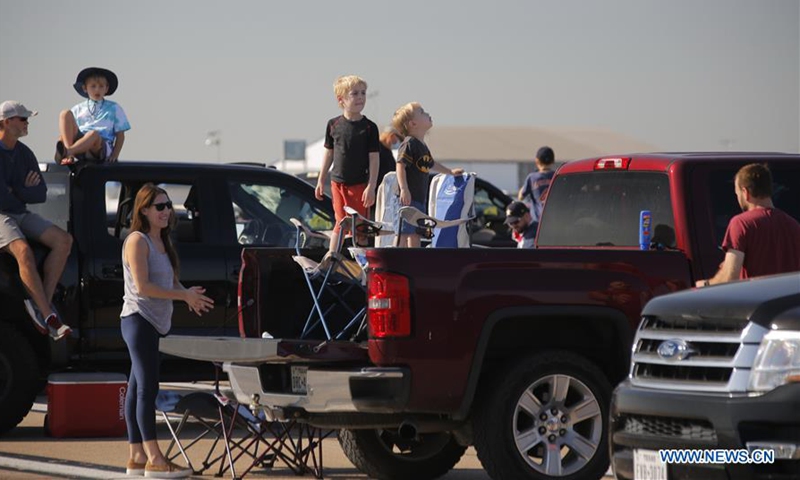 Visitors stay close to their cars waiting for the air show in Houston, Texas, the United States, on Oct. 10, 2020. The annual Wings Over Houston Airshow kicked off at the Ellington Airport on Saturday with thrilling aerial performances and displays. Visitors were asked to drive their cars to the show field and stay close to the cars during the show amid the COVID-19 pandemic. (Photo by Lao Chengyue/Xinhua)